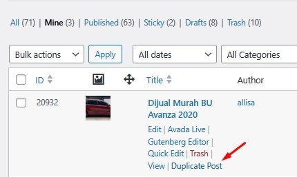 ( 1 ) Pada menu post silakan pilih “Duplicate Post” dan kemudian sistem menambahkan satu yang masih “draft” dengan nama dibelakangnya sebagai “…copy