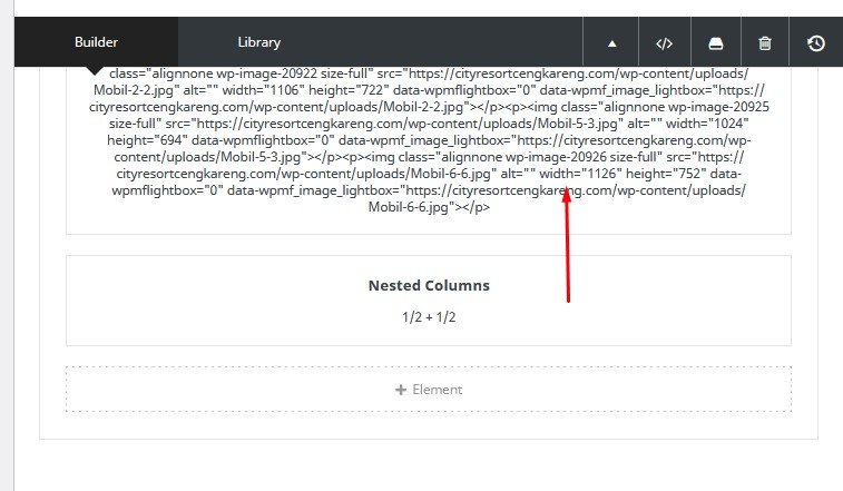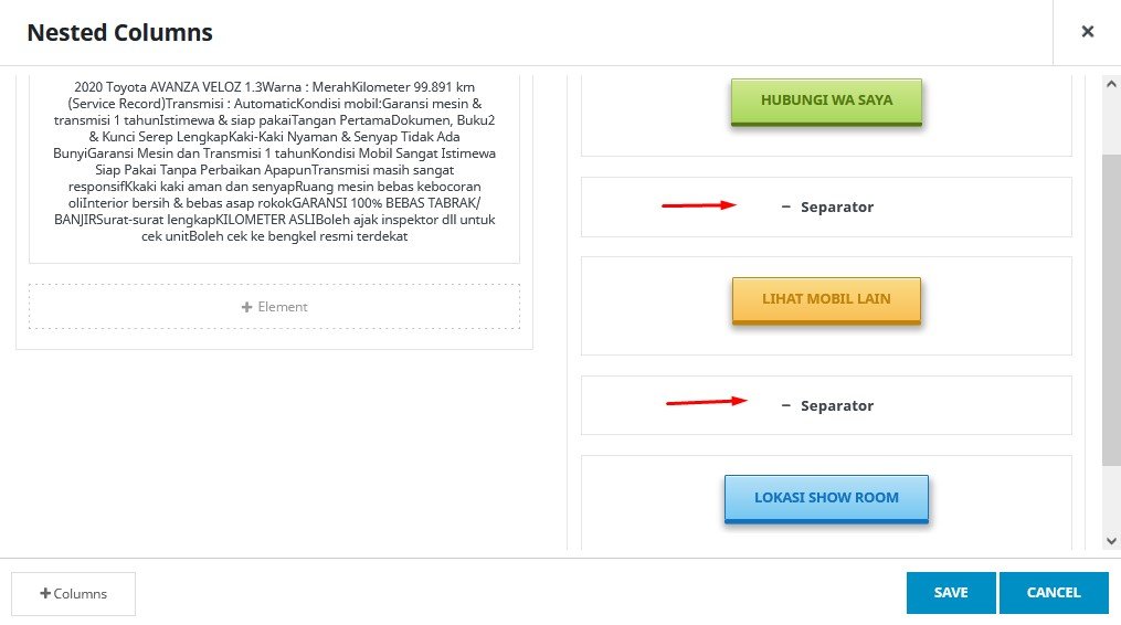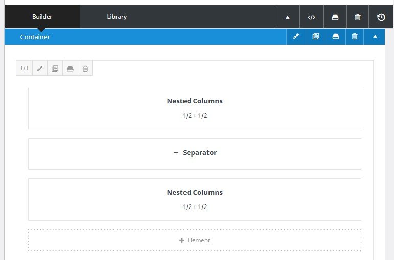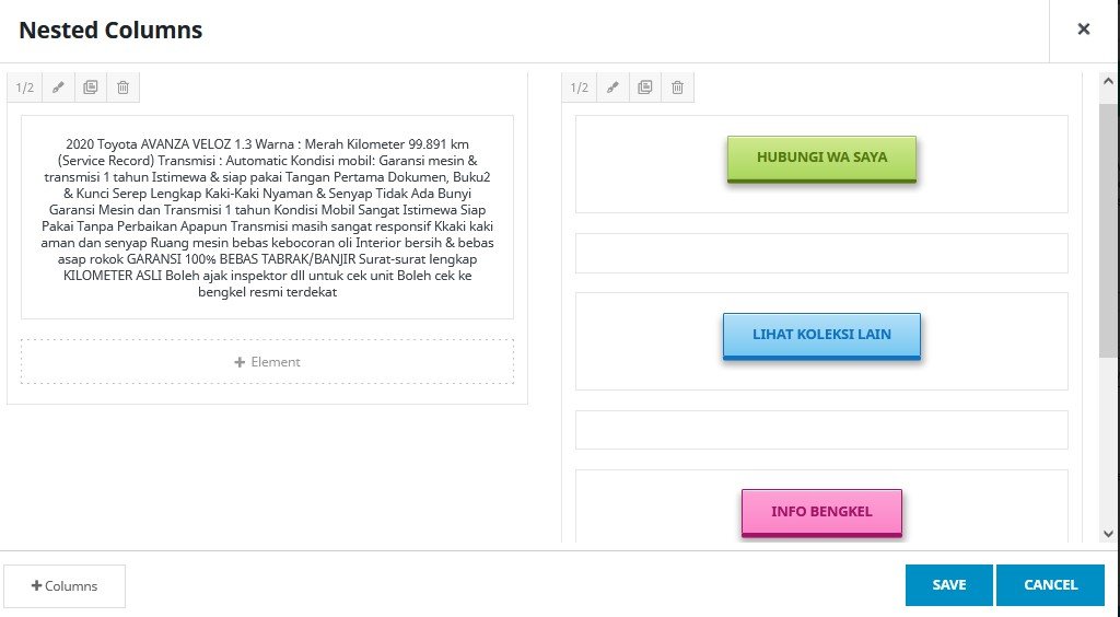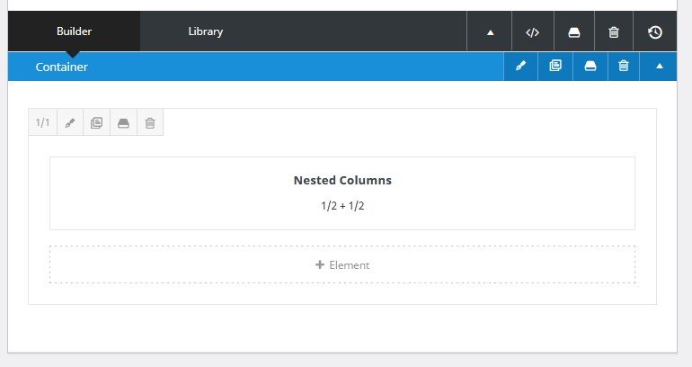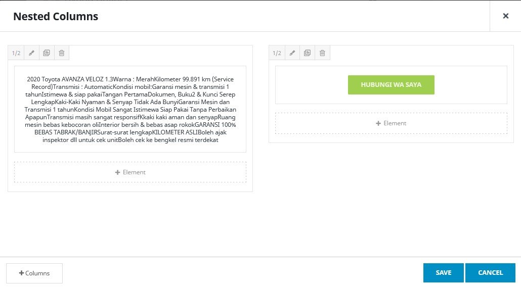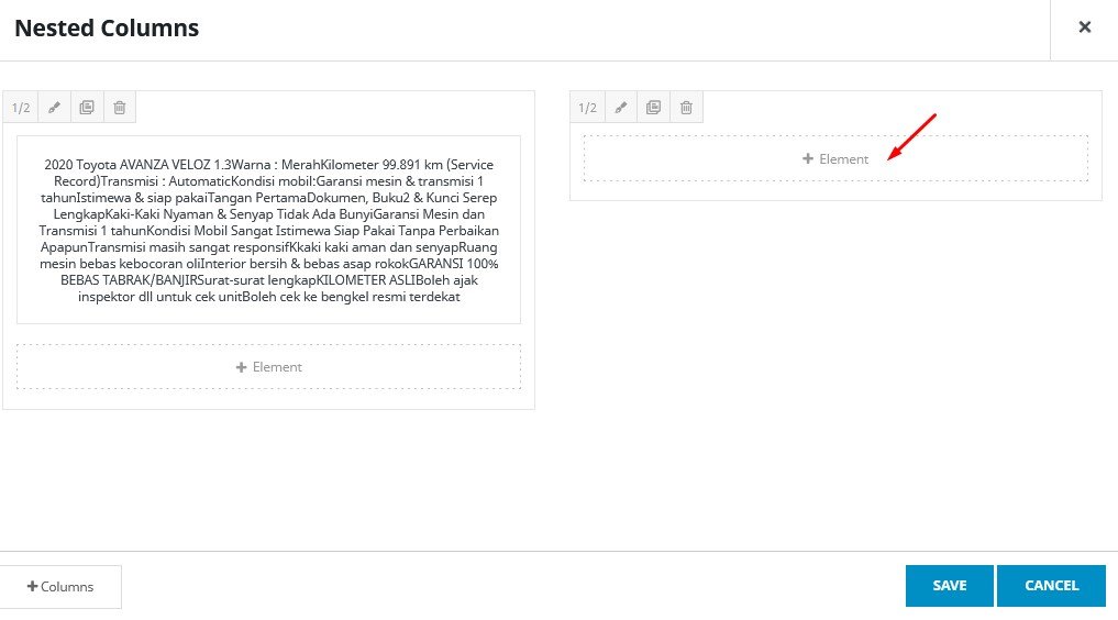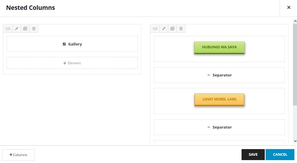 ( 4 ) Membuat 2 kolom layar, pilih “+ Element” , lalu pilih “Nested Columns”, pilih “1/2 – 1/2”