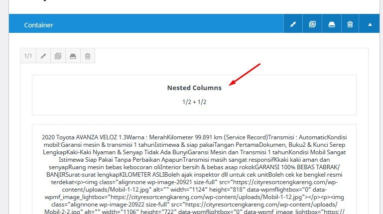 Kemudian masuk (edit) ke nested column yang baru, dan hapus text block sebelah kiri