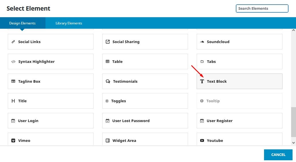 Kemudian setelah di dalam kolom 1/2+1/2 itu , tambahkan element pada kolom kiri , cari element dan pilih  element “Text Block”