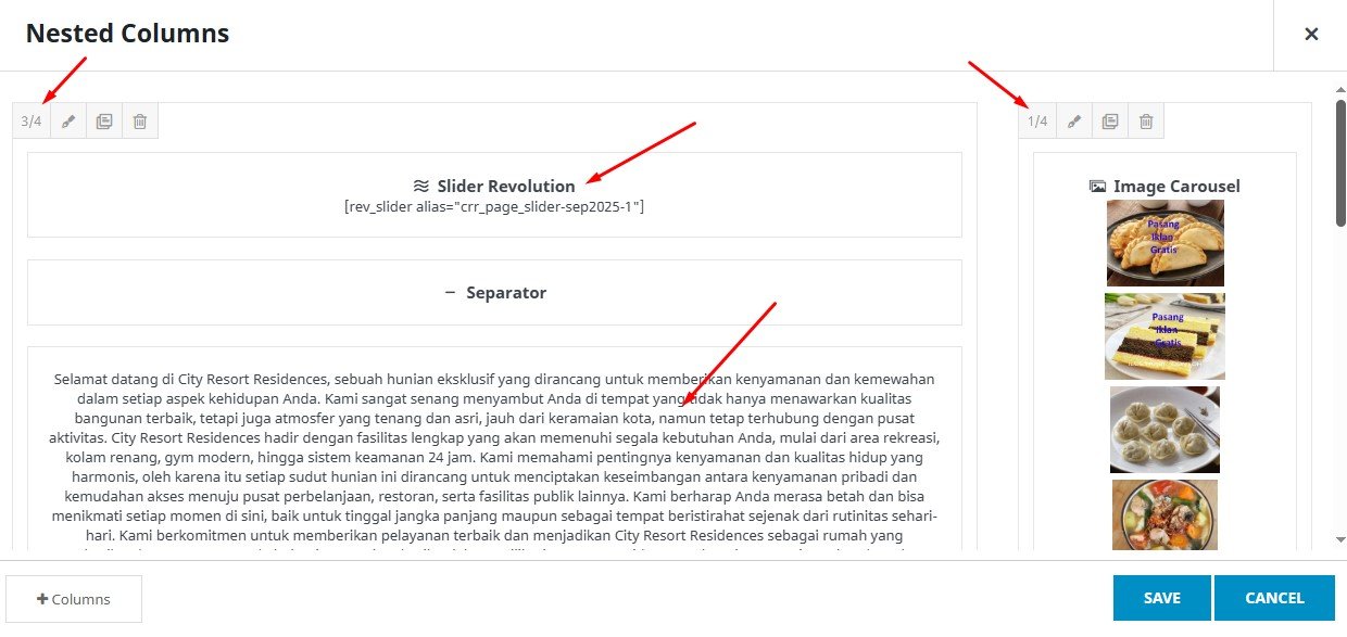 • Pada kolom kiri terdapat Slider Revolution dan di bawahnya ada Text Block, Separator