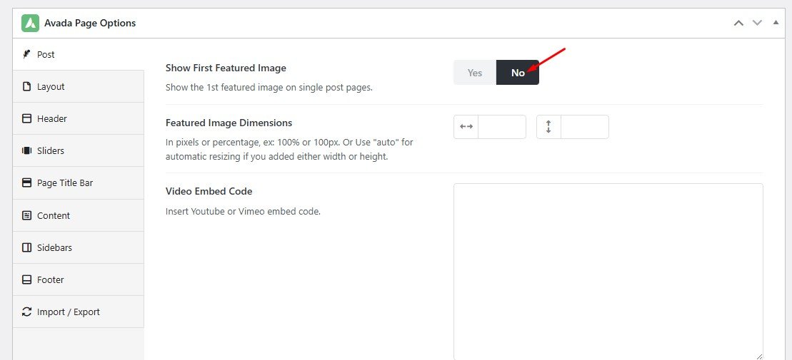 Kemudian geser ke bawah sampai ketemu “Avada Page Options” , dan isikan “No” pada Show First Featured Image