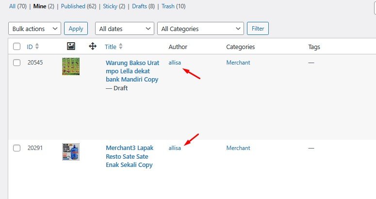 Lihat bagian kolom “Author” , lihat username itu siapa, jika artikel itu milik Anda maka username nya adalah Anda sendiri, lihat gambar di bawah ini, pemilik post tersebut adalah allisa, maka username = allisa dapat melakukan duplikasi, edit, delete (trash) pada post tersebut