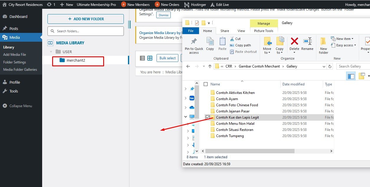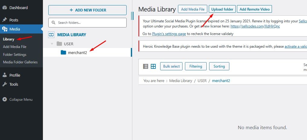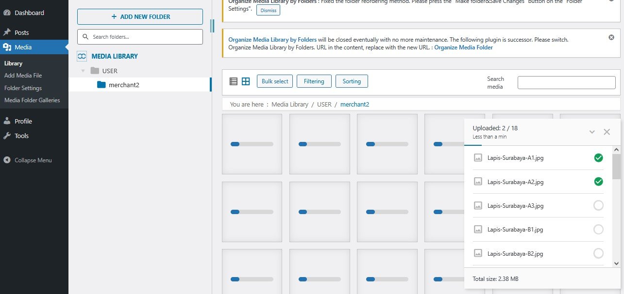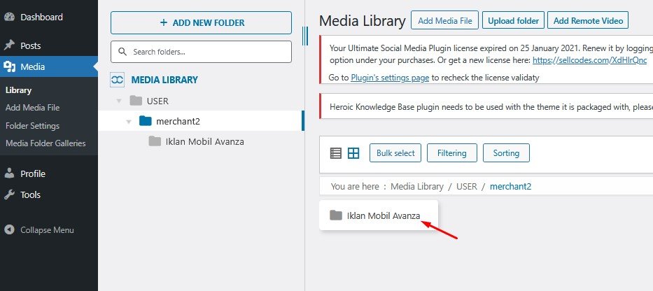 Kemudian pada media library dan folder milik sendiri ( sesuai nama username ), cari di tengah atas ada menu “Upload Folder” , uploadlah folder itu
