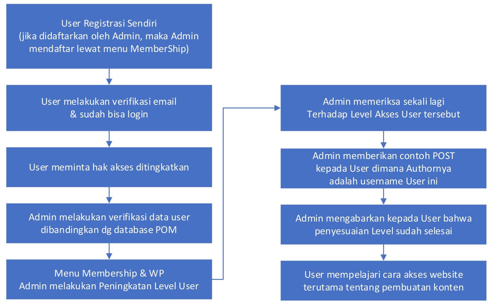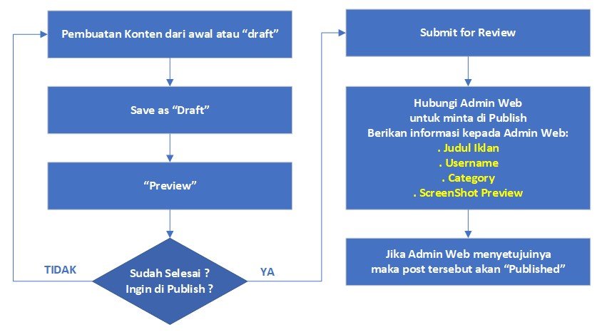 Flowchart berikut ini menggambarkan dari proses pembuatan konten dari status “Draft” sampai “Publish” dengan cara mengajukan “Submit for Review” kepada AdminWeb. Post yang sudah di approve (disetujui) oleh AdminWeb maka post tersebut akan tampil pada halaman situs ini dan dapat dilihat oleh user lain