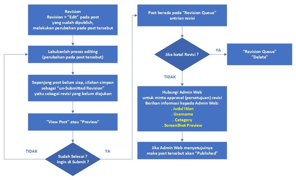 Flowchart berikut ini menggambarkan dari proses revisi konten dari status “Revision” sampai “Publish” dengan cara mengajukan “Submit Revision” kepada AdminWeb. Revision Post yang sudah di approve (disetujui) oleh AdminWeb maka post revisi tersebut akan tampil menggantikan post sebelumnya